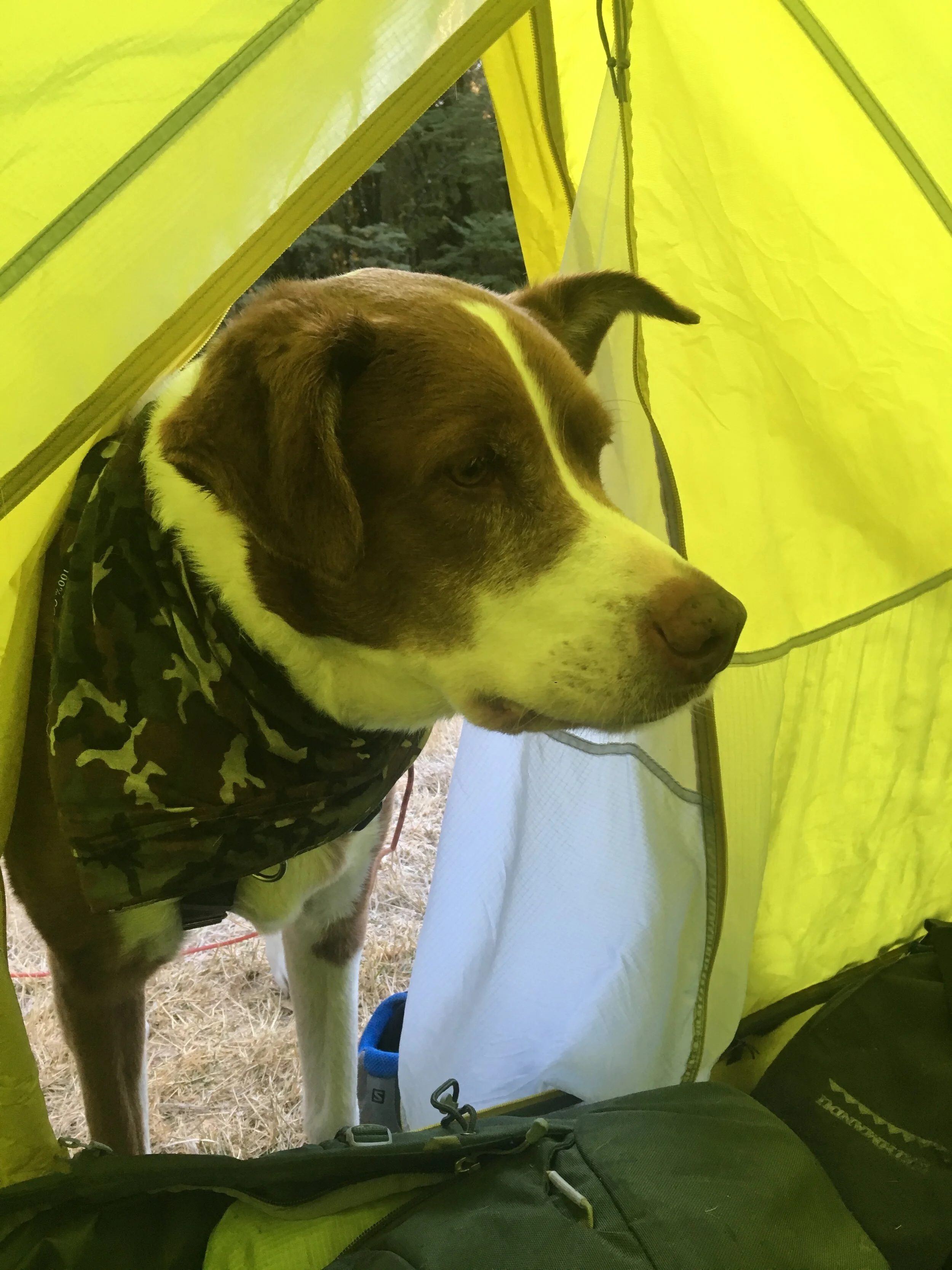 The primitive hut was straight out of a storybook with its wood burning fireplace, quaint guestbook, and porch. Huts are not dog-friendly so we pitched our tent in a sunny spot nearby to enjoy a snack and a snooze. We read the guestbook which warned us of unsavoury track conditions for our route out - a red flag we should have heeded - and reports of snow just a week prior.
